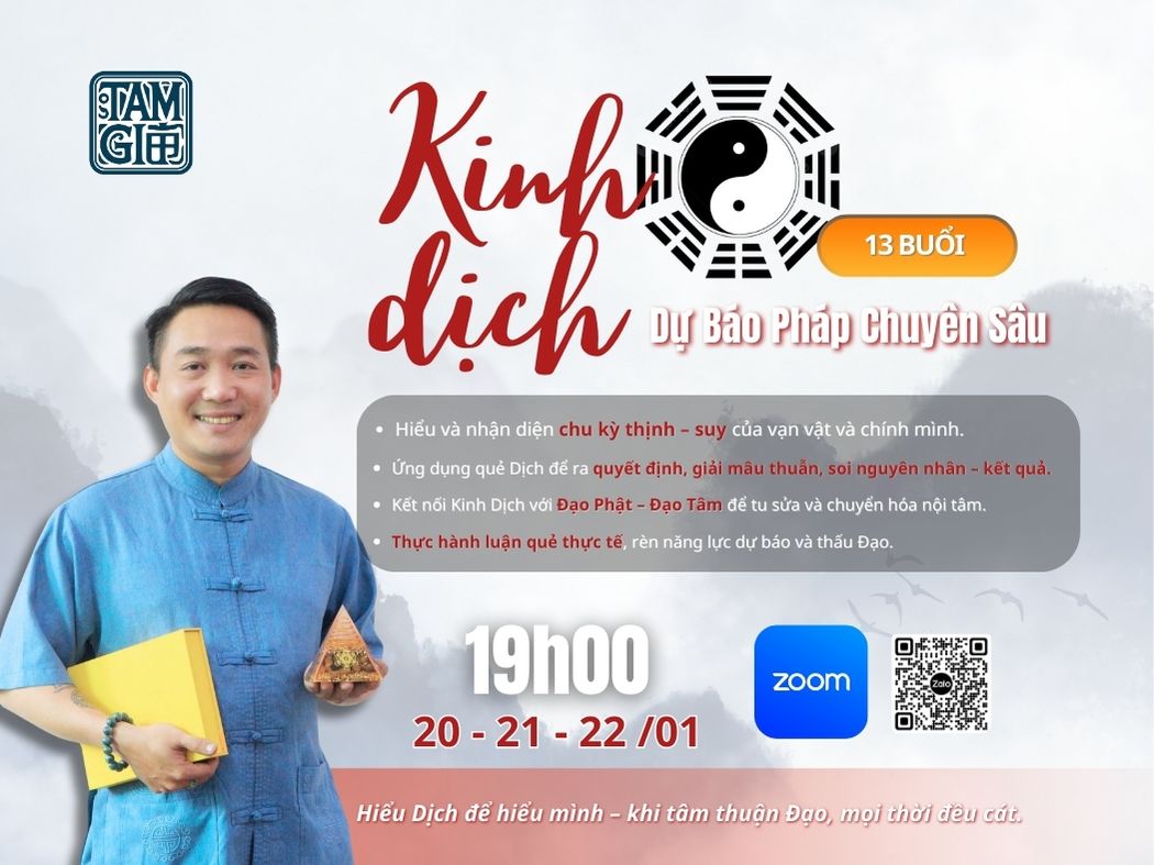 Khóa học “Kinh Dịch Dự Báo Pháp Chuyên Sâu” do Học Viện Fengshui Tam Gia tổ chức (20 – 21 – 22/01) được thiết kế dành cho những ai mong muốn đi sâu vào trí tuệ cổ phương Đông, vượt qua cách học Dịch như bói toán để chạm đến tầng triết lý vận hành của vũ trụ và nhân tâm.