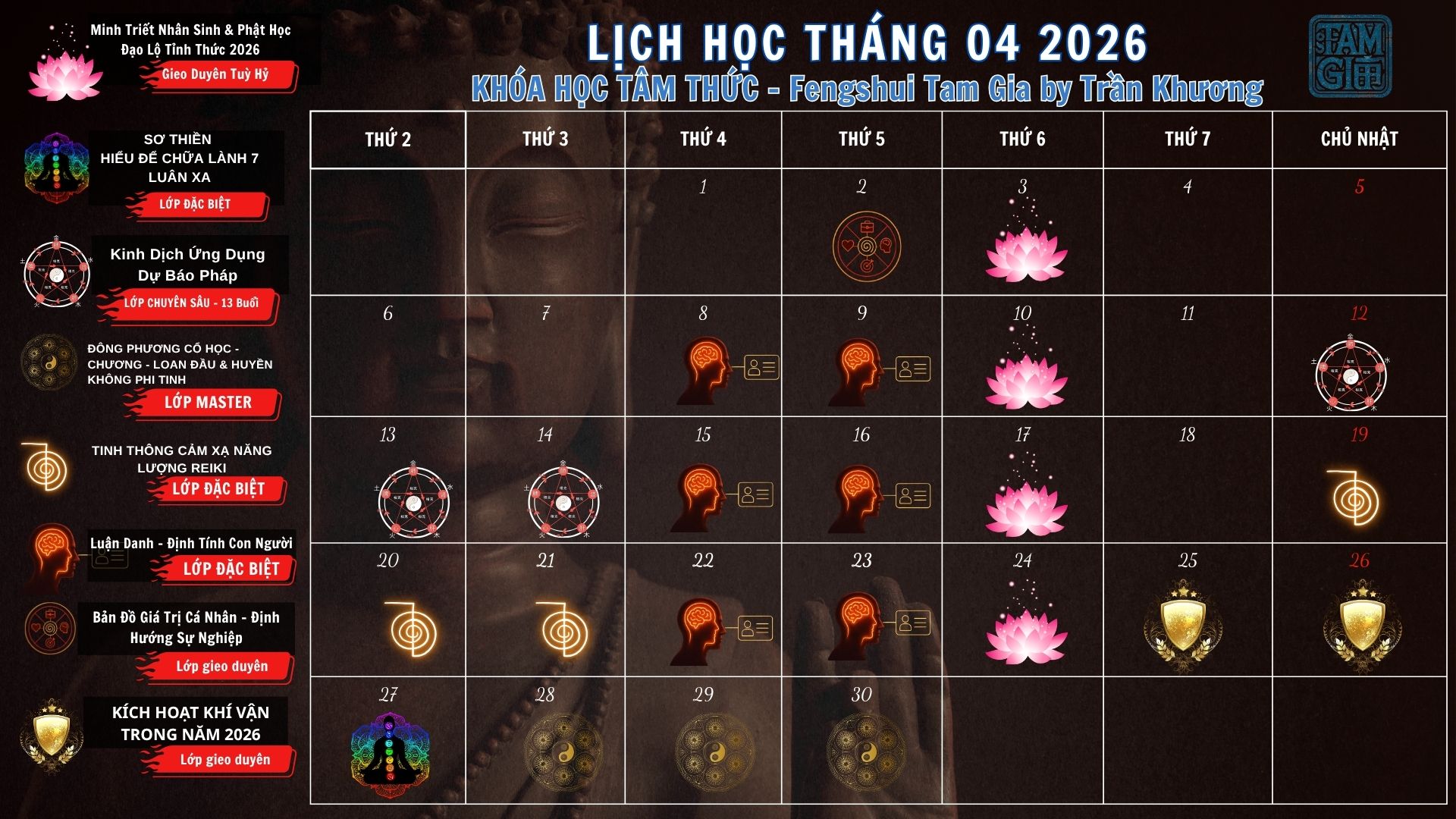 Tháng 04/2026 đánh dấu giai đoạn đào sâu chữa lành – nhận thức – ứng dụng thực tế, với hệ thống khóa học được thiết kế theo lộ trình rõ ràng. Đây không phải là những lớp học lý thuyết đơn thuần, mà là hành trình giúp người học hiểu lại chính mình, điều chỉnh tư duy và nâng cấp cách sống.