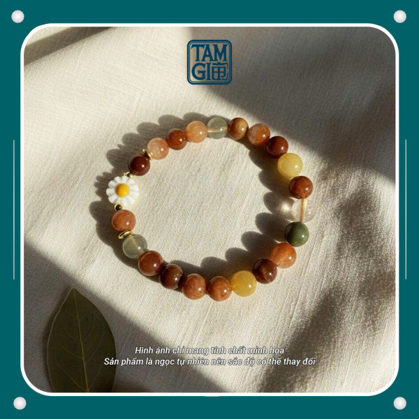 • Chất liệu: Thạch Anh Tự Nhiên (Mix nhiều loại: Vàng, Nâu Đỏ, Xanh Rêu, v.v.), Charm Hoa Cúc.